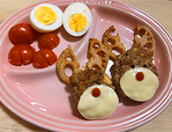 - それぞれお皿に盛っていきます。レンコンはトナカイの角に見立てて置きます。トナカイの目は黒ゴマを3~4粒程置くと可愛く仕上がります。スライスチーズを丸形にかたどり、ハンバーグの下あたりにおき、鼻に見立ててケチャップをつけます。これで完成です。
